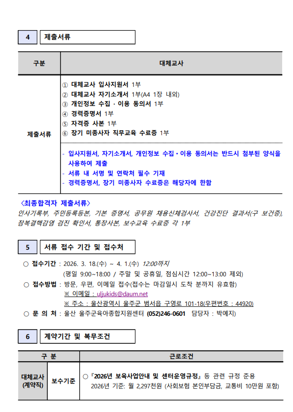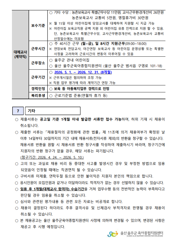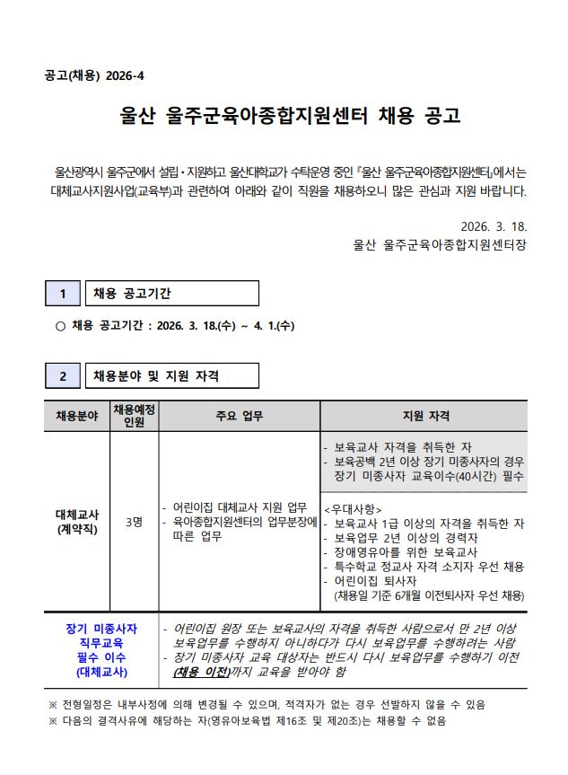 [울산 울주군육아종합지원센터] 2026-4 직원(대체교사) 채용 공고 안내