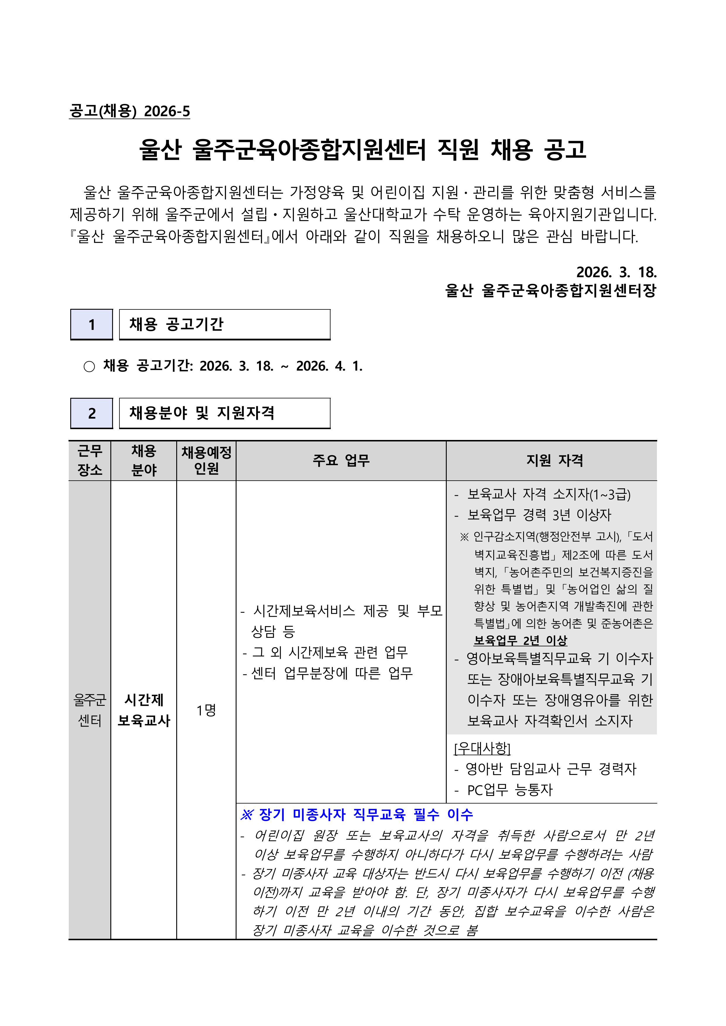 [울산 울주군육아종합지원센터] 2026-5 직원 채용 공고 안내 (~4/1까지)