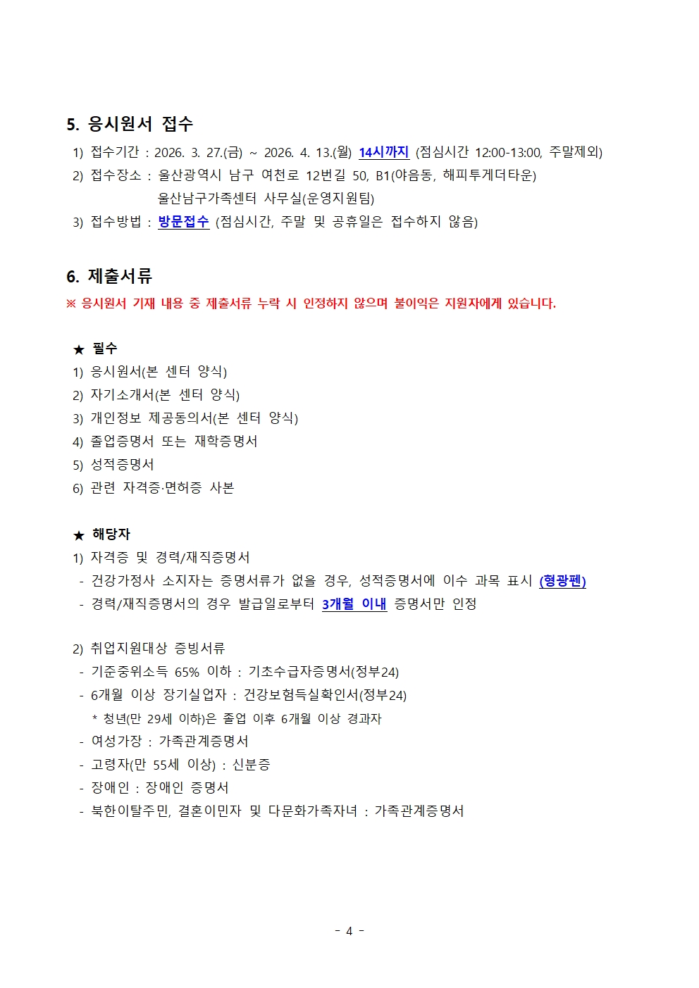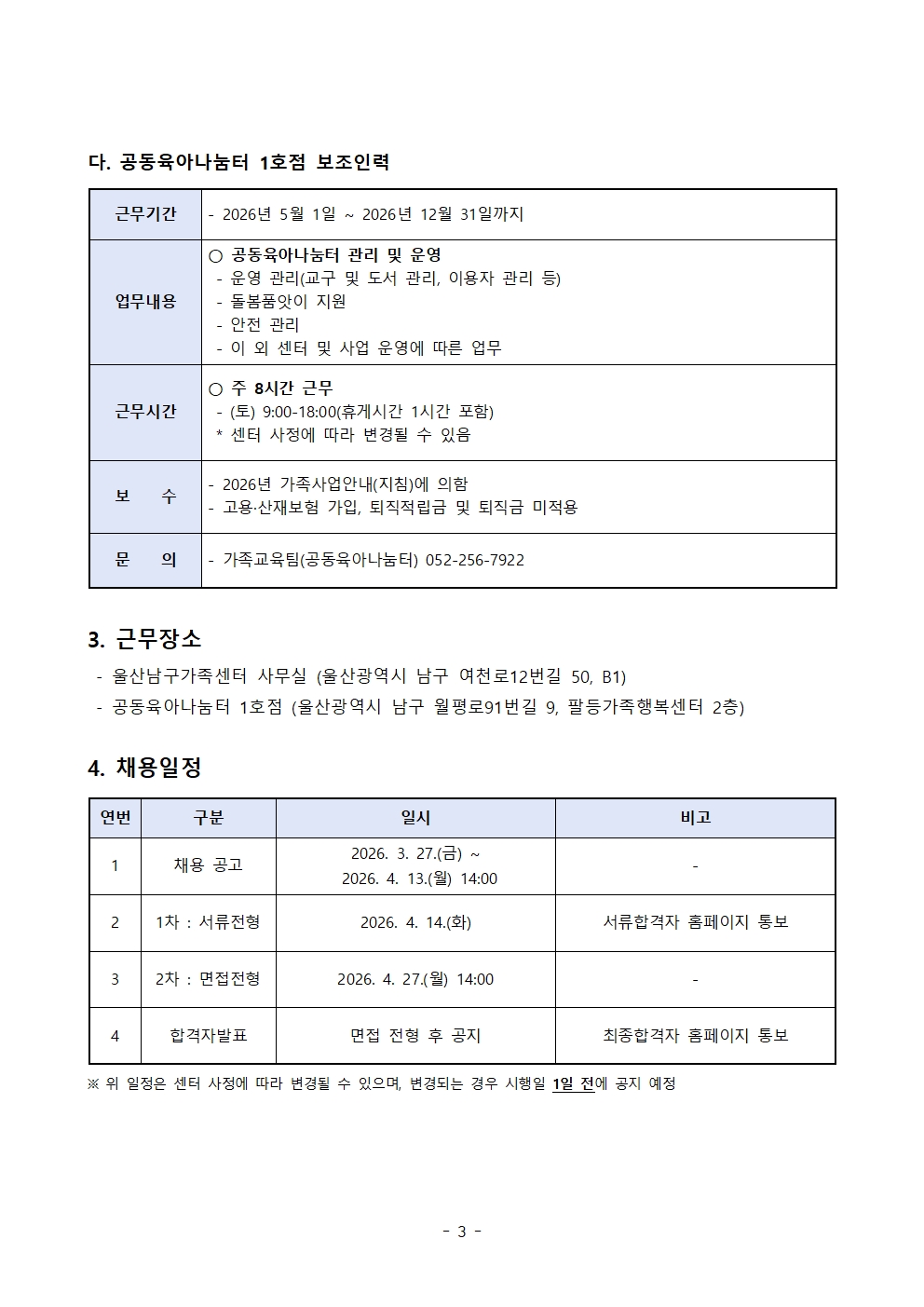 [울산남구가족센터] 공동육아나눔터 1호점 보조인력 채용 공고