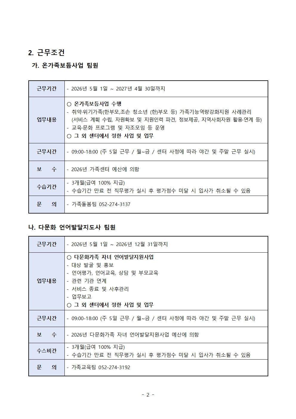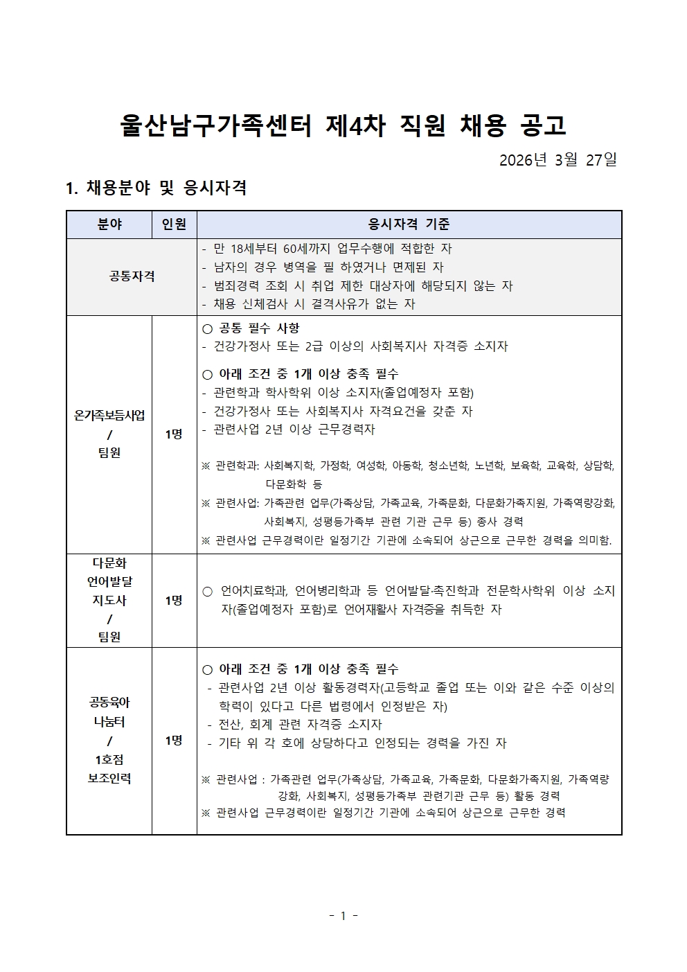[울산 울주군육아종합지원센터] 2026-5 직원 채용 공고 안내 (~4/1까지)