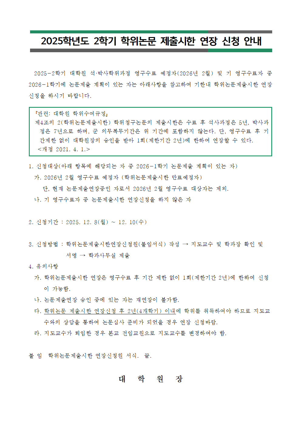 2025학년도 2학기 학위논문 제출시한연장 신청 안내