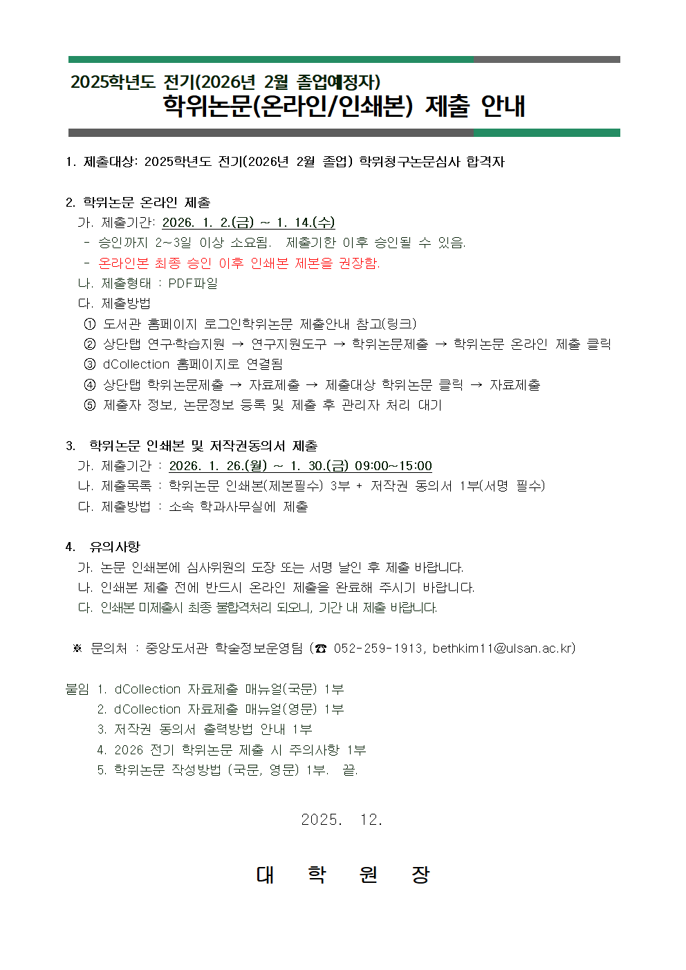 2025학년도 전기(2026년 2월 졸업예정자) 학위논문(온라인/인쇄본) 제출 안내