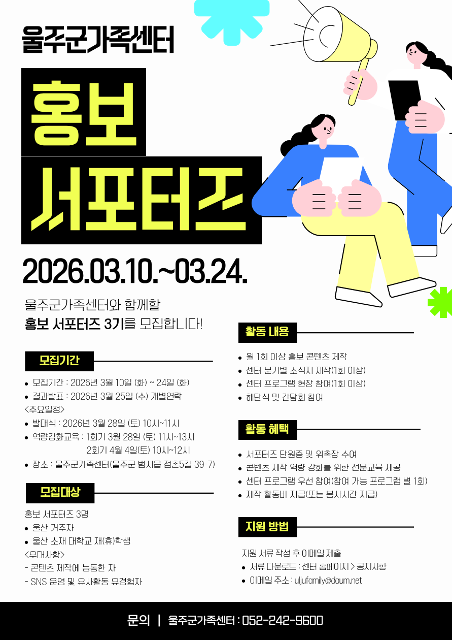 [울주군가족센터] 2026년 홍보 서포터즈 모집] □ 모집개요 - 모집인원 : 홍보 서포터즈 총 3명 - 활동기간 : 2026년 3~12월 - 활동 내용 : 센터 SNS 콘텐츠 제작 및 온라인 홍보 활동 등
