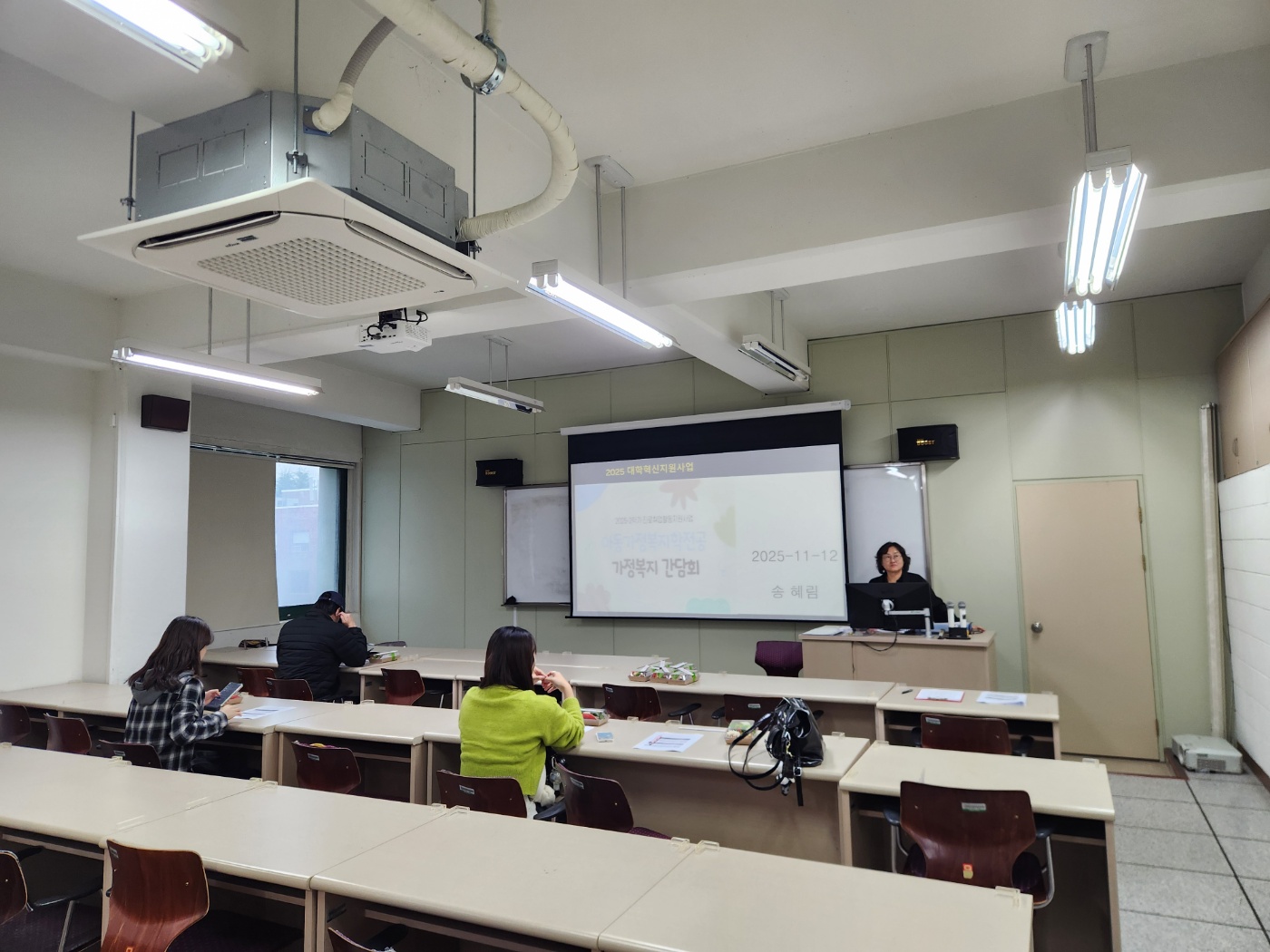 2025년 11월 12일 (수), 진로취업지원사업 가정복지 간담회를 진행했습니다. 송혜림 교수님께서 진행해주셨습니다.